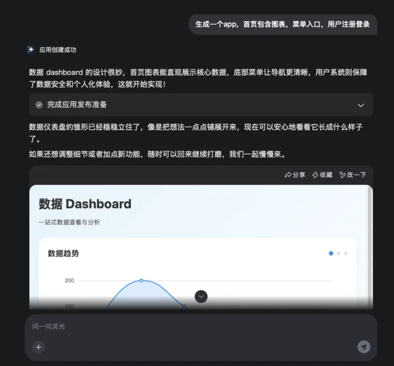 你有想法 -> 丢给灵光 -> 瞬间得到App -> 不满意?随口一说就改好 -> 代码不懂?它帮你写 -> 搞定下班!