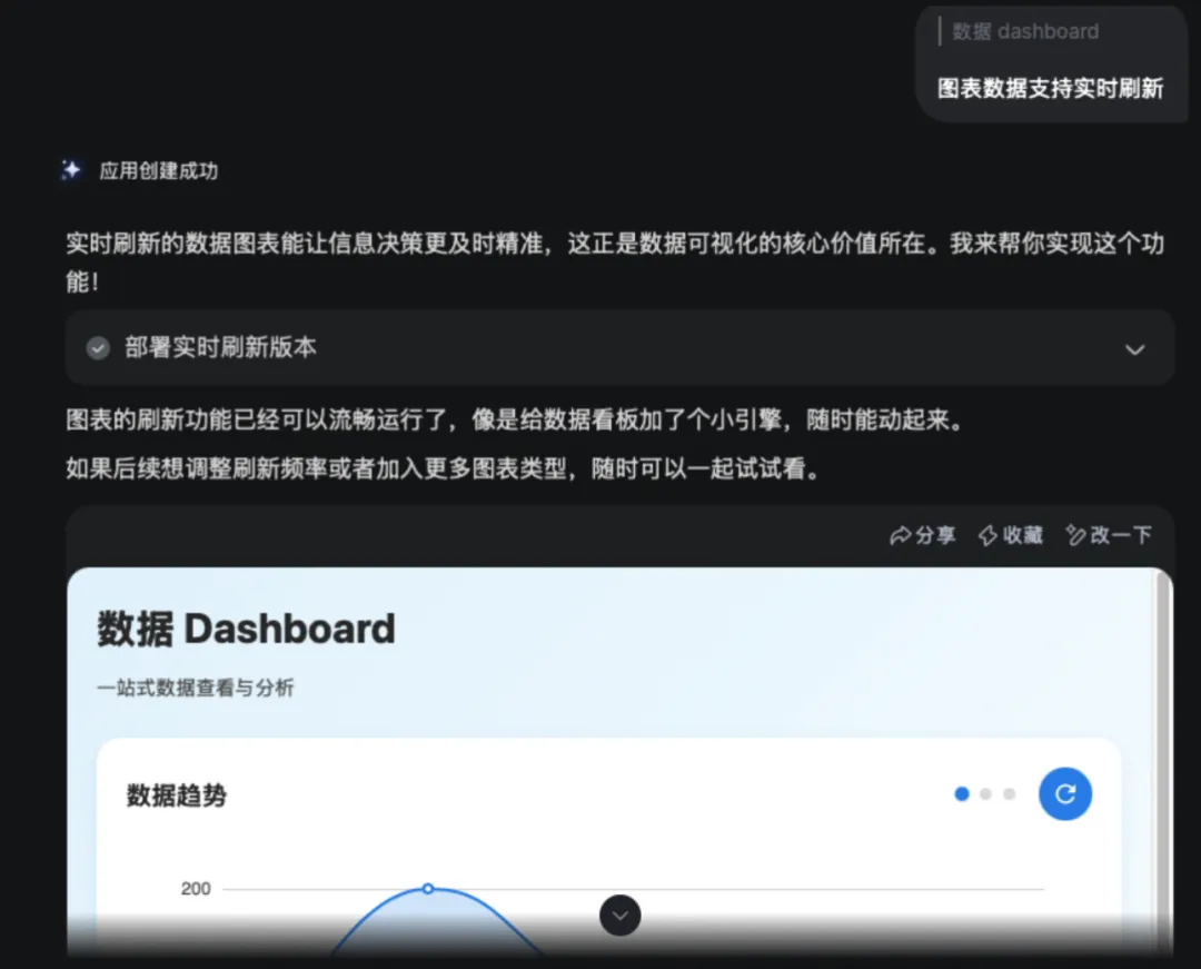 在生成完模版之后,我又改了一下功能,给出更细节的需求,比如”图表数据支持实时刷新“,得到优化后的app。